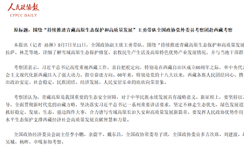 9月7日至11日,全國政協(xié)副主席王勇帶隊,圍繞“持續(xù)推進青藏高原生態(tài)保護和高質(zhì)量發(fā)展”...